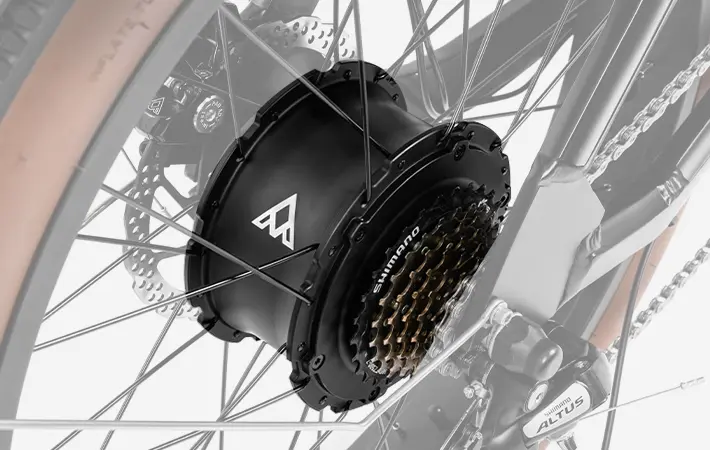 ebikes for adults Addmotor E‑325 is equipped with a 750W rear‑drive brushless hub motor delivering up to 1,400W of peak output and 90Nm of torque. This high‑torque drivetrain is engineered for strong low‑speed traction, stable acceleration, and reliable performance under heavy load. Paired with a 48V electrical system and a 25A controller, the motor provides enhanced surge power for confident starts, hill climbing, and sustained operation in demanding cargo scenarios. The rear‑drive configuration improves traction and directional stability, while optimized thermal management ensures consistent power delivery during use. This motor architecture enables smooth, responsive torque control and efficient energy utilization across urban, family, and utility‑cargo environments—qualities expected from a modern heavy‑duty electric bike designed for real‑world load handling.